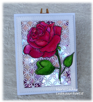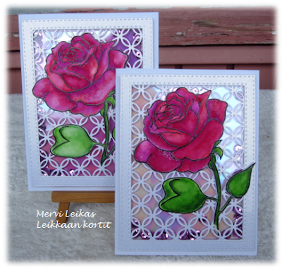 Mukava tehdä välillä muutakin kuin joulua! Kahdelle askartelevalle ystävälle synttärikortit. Sain vihdoin kastettua ihanan ruusuleimasimen musteeseen! Väritys Zig CCRB vesiväritusseilla. Helistinkortissa paljetit, pohjalla Shimmer Sheetz, todella hankala kuvattava, kun oma naama näkyi peilistä koko ajan.